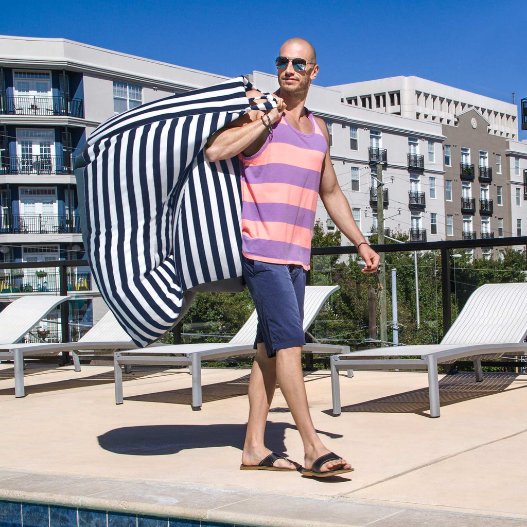 Introducing the Jaxx Prado Outdoor Bean Bag Chaise Lounge Chair in Navy Blue and White Stripes – the perfect addition to your outdoor oasis. If you're seeking unparalleled comfort and style, look no further. This outdoor bean bag chair is meticulously designed to elevate your relaxation experience, making every moment spent outdoors a sheer delight.